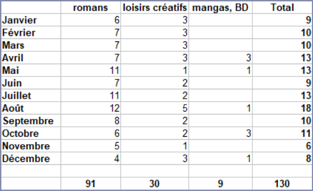 En rajoutant les mangas, beaux livres, loisirs créatifs, etc, on atteint un total de 130 critiques soit 17 de plus que l’an dernier ! Les loisirs créatifs n’y sont cette fois pour rien, avec 30 critiques, soit même une en moins. Sinon, j’ai lu 9 mangas (one-shots comme séries complètes comptant pour 1, c’est l’œuvre qui compte pas le nombre de volumes), soit, là encore, trois de moins que l’an passé. Doooonc… oui, j’ai bien lu plus de romans !