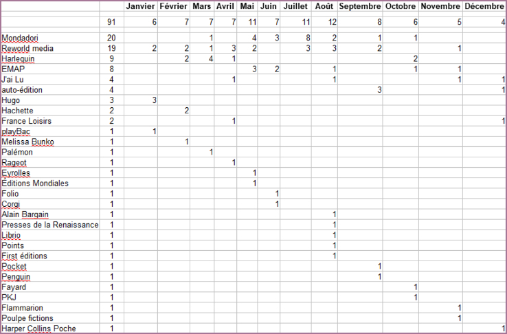 Une fois n’est pas coutume, ça tombe sur Mondadori avec 20 lectures. Bon, d’accord, ça reste un peu la même chose, surtout quand derrière c’est Reworld media avec 19 livres. En troisième place, ça ne bouge pas : Harlequin avec 9 lectures.