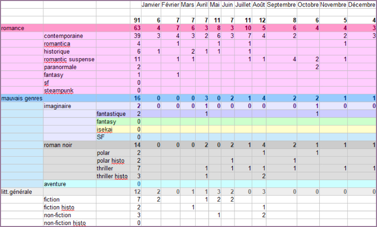 1 sous-genre de plus que l’an passé, confirmant le retour de l’imaginaire. Il y a aussi beaucoup plus de romantic suspense et deux fois plus d’histo. Ce n’est pas que je me lasse de la contempo (encore très largement majoritaire), simplement que le hasard m’a permis de davantage varier mes lectures.